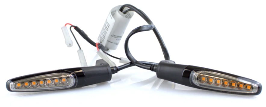 Para LED-owych pływających kierunkowskazów z 7 diodami LED o dużej mocy. Każdy z kierunkowskazów posiada obudowę z odlewanego aluminium z czarnym wykończeniem i logo Triumph.